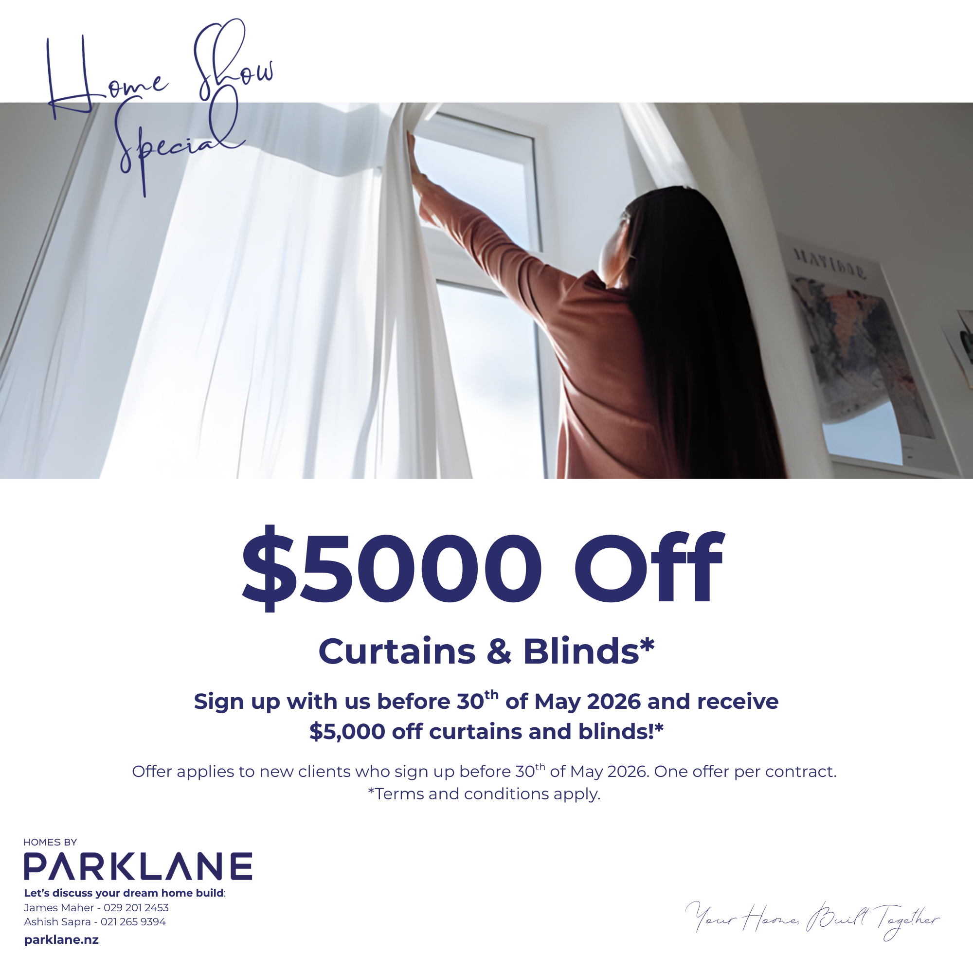 Sign up with us before 30th of May 2026 and receive $5,000 off curtains and blinds!* Offer applies to new clients who sign up before 30th of May 2026. One offer per contract. *Terms and conditions apply.