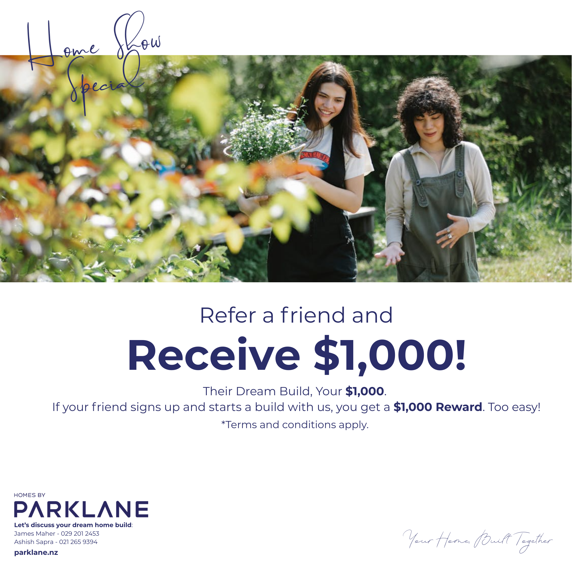 Refer a friend and receive $1,000! If your friend signs up and starts a build with us, you get a $1,000 Reward. Too easy! T's & C's Apply.